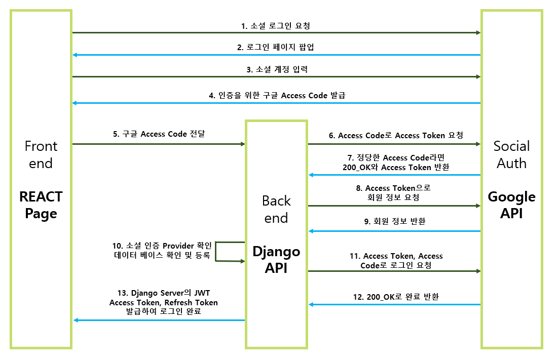 여기서 중요한 점이 있는데 프론트엔드에서 구글 API로 최초 로그인 요청을 하는 1~4단계의 인증 요청 URI 와