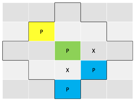 P는 사람, X는 칸 막이, 초록색은 기준, 파란색은 거리두기를 지키는 사람, 노란색은 거리두기를 지키지 않는 사람이다.