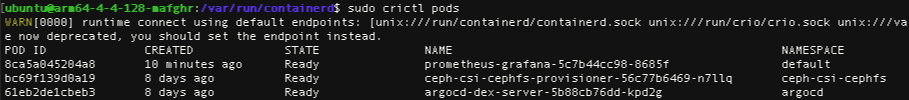 # WARN[0000] runtime connect using default endpoints: [unix:///run/containerd/containerd.sock unix:///run/crio/crio.sock unix:///var/run/cri-dockerd.sock]. As the default settings are now deprecated, you should set the endpoint instead.
