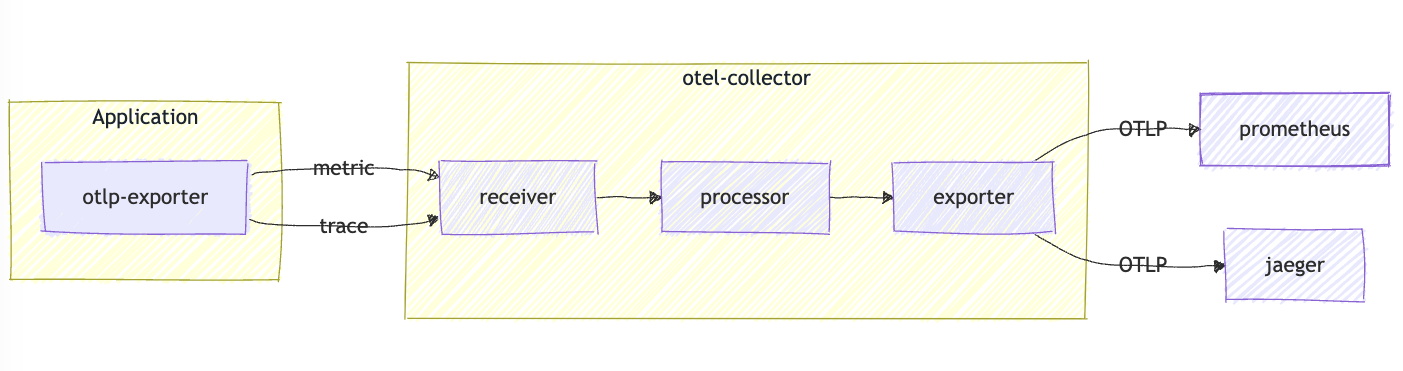 OpenTelemetry(콜렉터)는 수집, 처리 및 전송 을 담당하고, 이에 대한 저장-쿼리는 연결된 플랫폼에 위임한다.