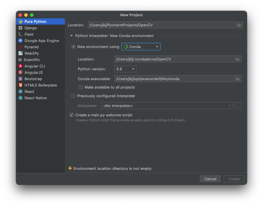 파이참에 파이썬 3.9를 이용할 것이다. 파이썬 가상 환경을 venv를 쓸지 아나콘다를 쓸지 고민했는데 아나콘다를 써보려다가 opencv 버전 문제로 그냥 원래 쓰던 venv 쓰도록 하겠다.