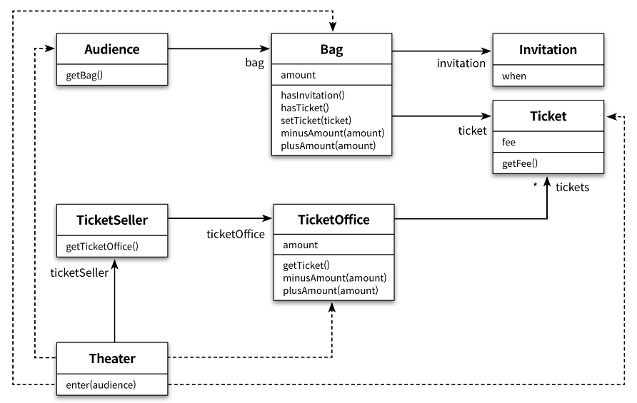 맨 위의 다이어그램을 확인하면 Audience는 Bag을 가진다는 사실이나 TicketSeller가 TicketOffice를 가진다는 사실을 상위 객체에서 알 필요는 없다.